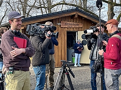Nach mehreren Telefonaten, Abstimmungen und Vor-Ort-Begehungen stand schließlich der Drehtag fest: 10. März 2026. Pünktlich um 10 Uhr traf ein achtköpfiges Kamerateam des SWR in Kirchen ein. Die ersten Aufnahmen entstanden auf der sogenannten Klickerarena des Vereins in der Kirmesfeldstraße. Dort wurde das traditionelle Klickerspiel vorgestellt und die beiden offiziellen Städte-Paten präsentiert: Bernd Schneider, 1. Vorsitzender des 1. Kirchener Klickervereins und Michaela Stötzel, selbst begeisterte Klickerin und zugleich Gästeführerin für das Druiden.Hexen.Siegerland der Touristik der Verbandsgemeinde Kirchen (Sieg)