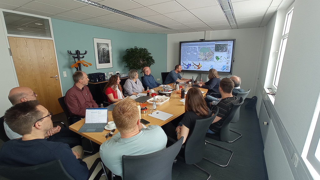 Ende April fand der erste Workshop im Handlungsfeld „Stadtentwicklung und Bauleitplanung“ im Kirchener Rathaus statt. Ziel war die Bewertung von Potenzialflächen anhand der Klimagefahren „Starkregen“, „Hochwasser“ und „Erosion“. Unterstützung erhielt das zehnköpfige Verwaltungsteam dabei vom Planungsbüro „info urban“ aus Dortmund.