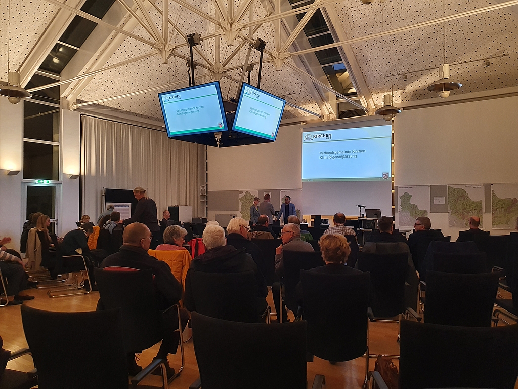 Am Montag, den 20. November 2023 fand im Ratssaal der Verbandsgemeinde Kirchen die Auftaktveranstaltung zur Klimafolgenanpassung statt. Mit einem bunt gemischten Publikum aus Bürgerschaft, Politik sowie fachlich spezialisierten verwaltungsangehörigen und externen Akteuren. Bereits zu Beginn der Veranstaltung konnten sich die Klimafolgenanpassungsinteressierten zum ersten Mal für diesen Abend aktiv einbringen. Über eine kurze Eingangsbefragung zu dem vorherrschenden Wissensstand in den Themengebieten „Folgen und Gefahren des Klimawandels“, „Ziele und Maßnahmen des Klimaschutzes“ und „Ziele und Maßnahmen der Klimaanpassung“ sowie der regionalen Herkunft in Kombination zur Gruppenzugehörigkeit wollten die Veranstalter einen Überblick von ihrer Zuhörerschaft und deren Vorwissen gewinnen.